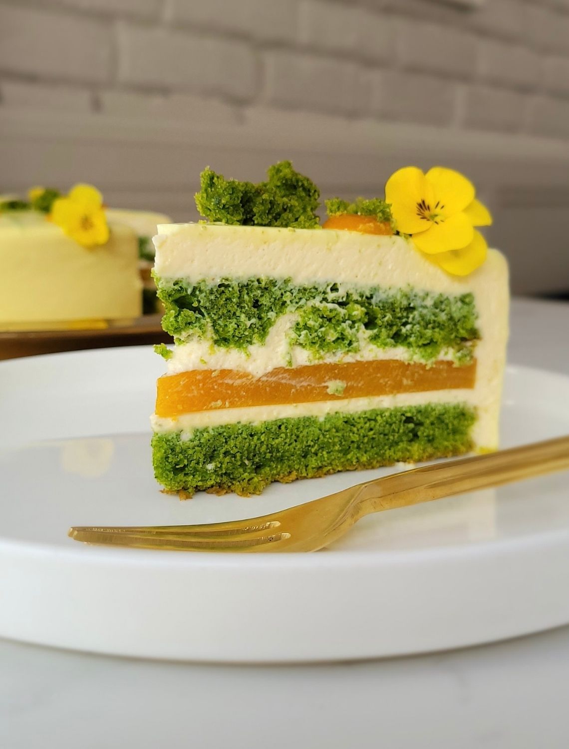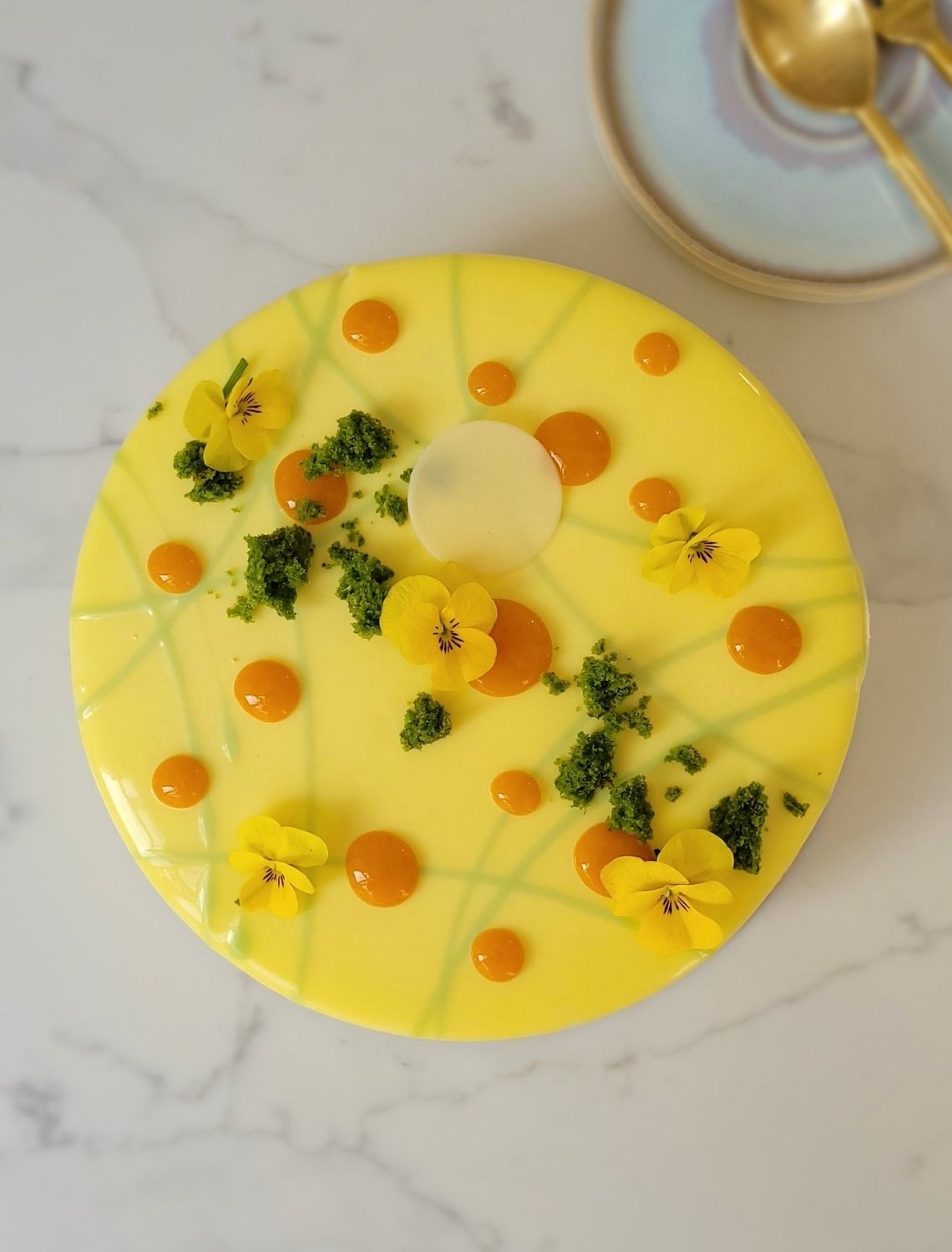 Tort MARAKUJA_SZPINAK to ciasto biszkoptowe ze szpinakiem w połączeniu z konfiturą z marakui i mango oraz musem na bazie belgijskiej białej czekolady z puree z marakui. Tort pokryty polewą z białej czekolady udekorowany jadalnymi kwiatami.